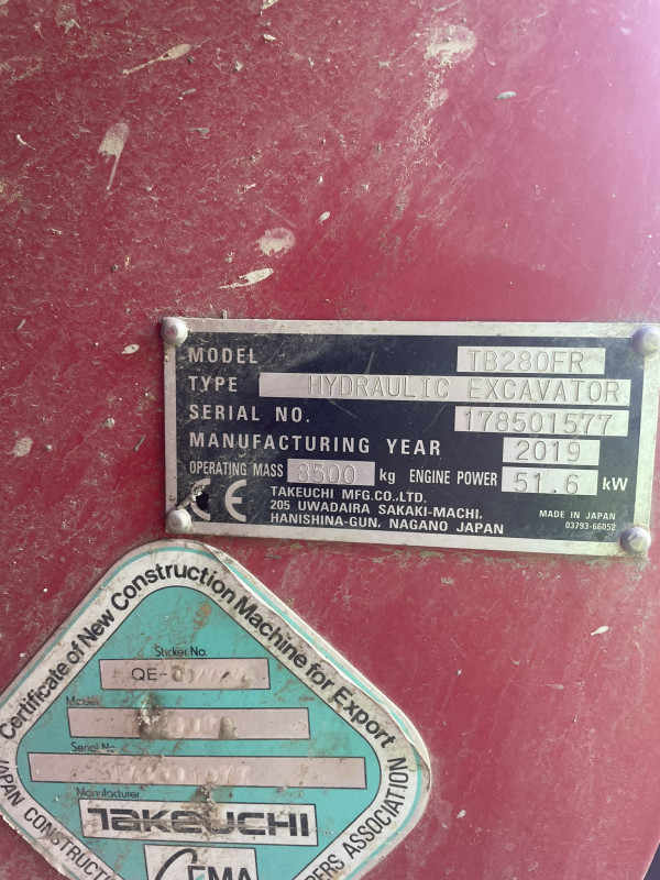 Pásový bagr Takeuchi TB280FR, rv. 2018, 8500kg, 5513mth, motor 51,6kw, naklápěcí hlava s hydraulický rychloupínáním, podkopové lžíce 30,60,100, svahovka 1500, zatmavená skla, 1. majitel, pravidelný servis (720300101)