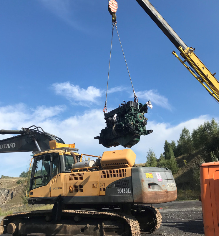 Opět velký bagr a převoz do dílen zbytečně drahý. Proto jsme si pro motor přijeli, vymontovali, odvezli do dílen, kde dostal vše nové co potřeboval a zpětná montáž v lomu.